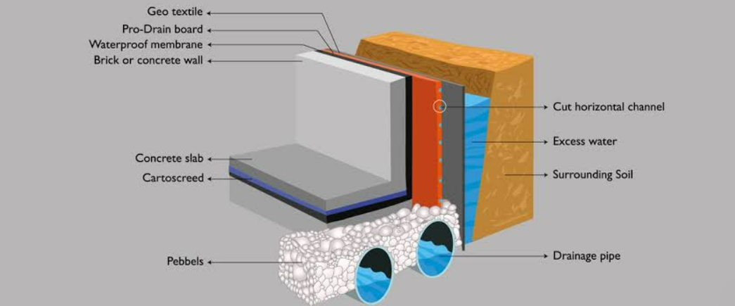 Üzeri delikli olan boruların üzeri keçe ile sarılır. Delikler, çamur gibi yapı malzemelerinden tıkanmaması için geotekstil keçe boruları etrafında çepeçevre dolandırılıp belirli bir eğim verilerek bir kuyuda toplanır ve kuyudan pompa yardımıyla borularla yönlendirilmesi veya pompayla binadan uzaklaştırılması gerekiyor.